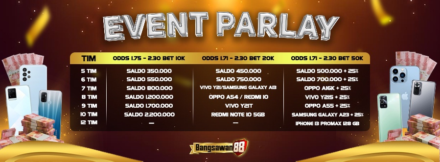 Bermain Parlay dan Menangkan 1 UNIT SMARTPHONE BEBAS PILIH + EXTRA 25% (maksimal ekstra bonus 5.000.000). Dapatkan juga bonus cashback mingguan hingga 0.5% tanpa syarat dan ketentuan.